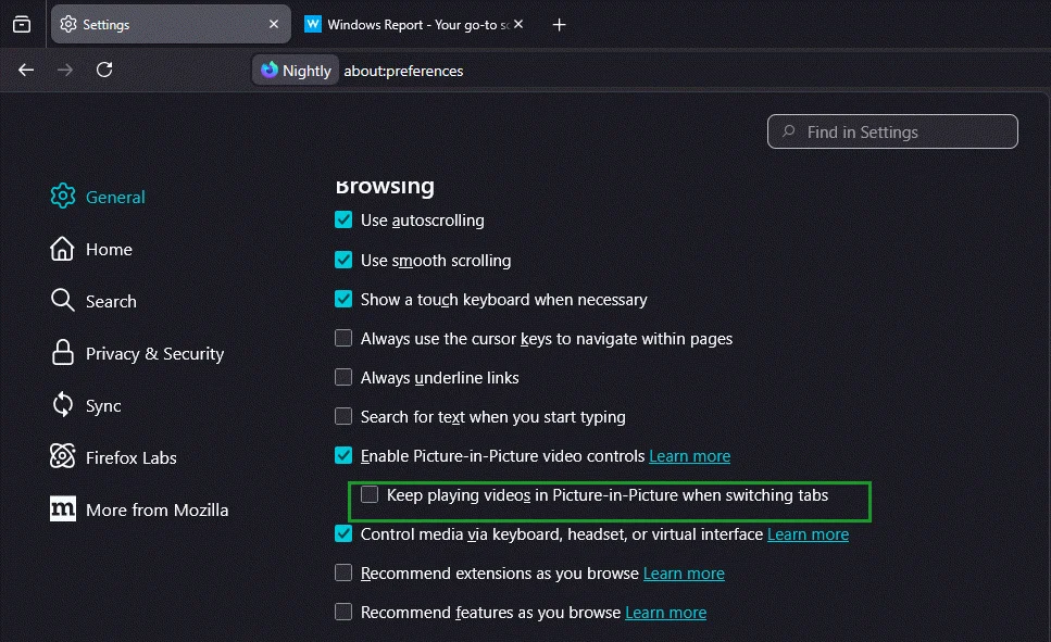پیشتر این ویژگی تنها در بخش آزمایشی Firefox Labs با نام «Picture-in-Picture: auto-open on tab switch» در دسترس بود و کاربران باید آن را بهصورت دستی فعال میکردند. اکنون موزیلا این قابلیت را از حالت آزمایشی خارج کرده و به بخش Browsing در تنظیمات عمومی منتقل کرده است. کاربران میتوانند با رفتن به مسیر Settings > General > Browsing و فعالکردن گزینه مربوطه، این قابلیت را روشن کنند.